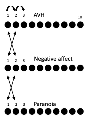 Finally, the temporal network (see Figure 3) uses data with a time lag (in this study, about 90 minutes), to predict for example whether voice-hearing at a certain timepoint (Monday 09.00 AM) is preceded by dissociation at the previous timepoint (Monday 07.30 AM). Although there is a lot of debate about whether this model indicates causality (A leads to B), it at least shows whether factor A precedes B, which is one of the requirements to indicate causality.